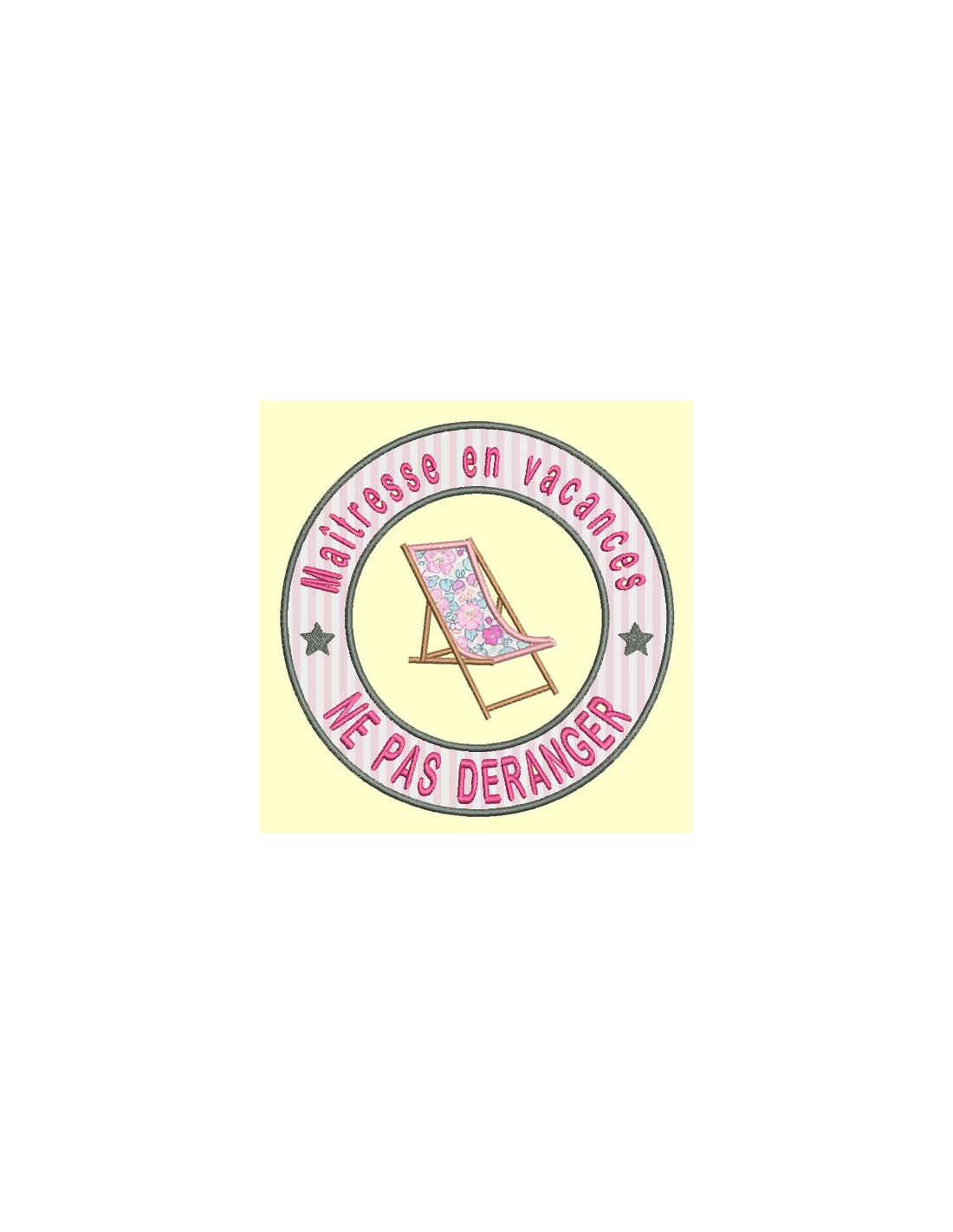 Motif de broderie machine représentant un motif pour maîtresse en vacances, logo avec un transat au centre.