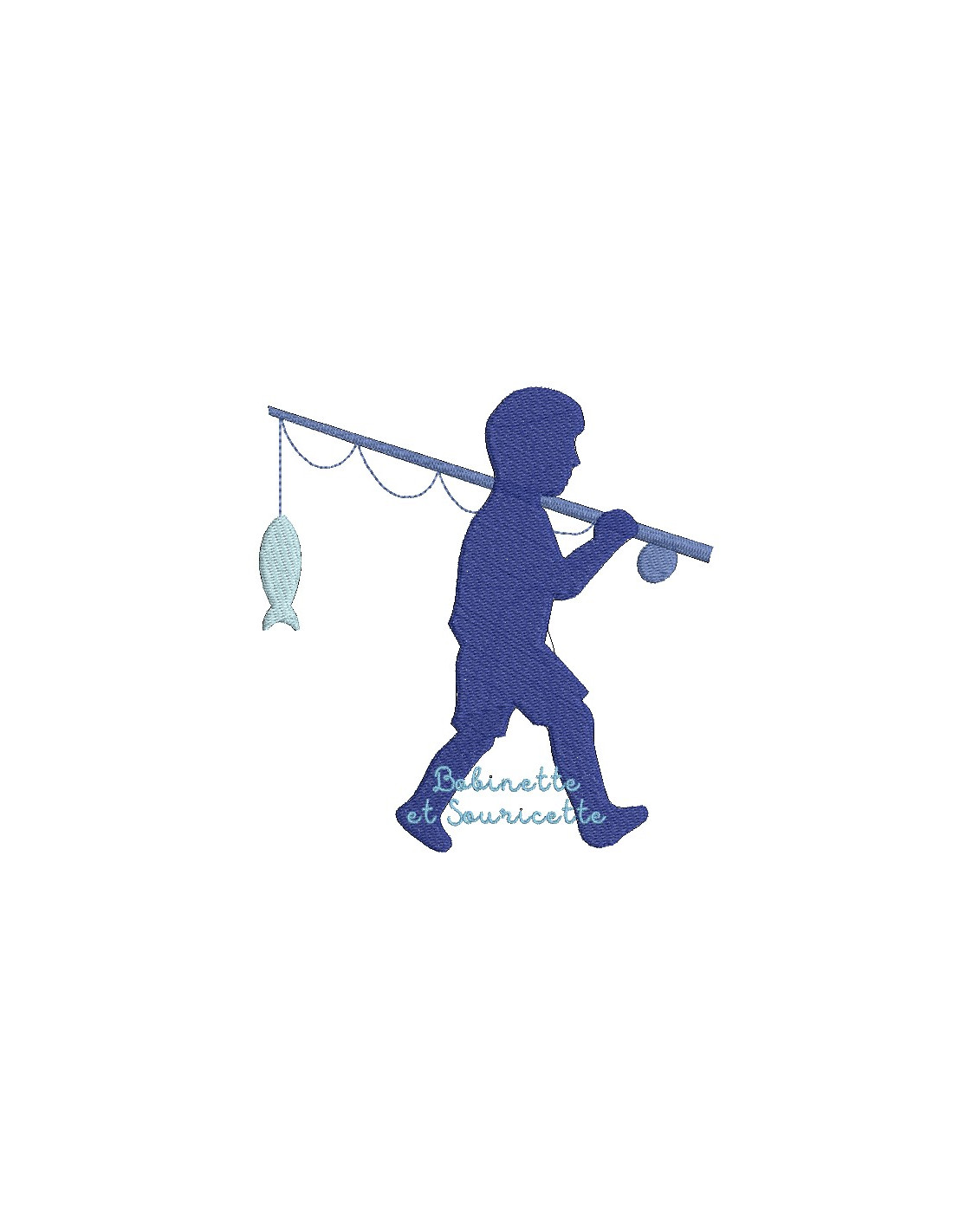 Motif de broderie machine en appliqué représentant un garçon partant à la pêche.
