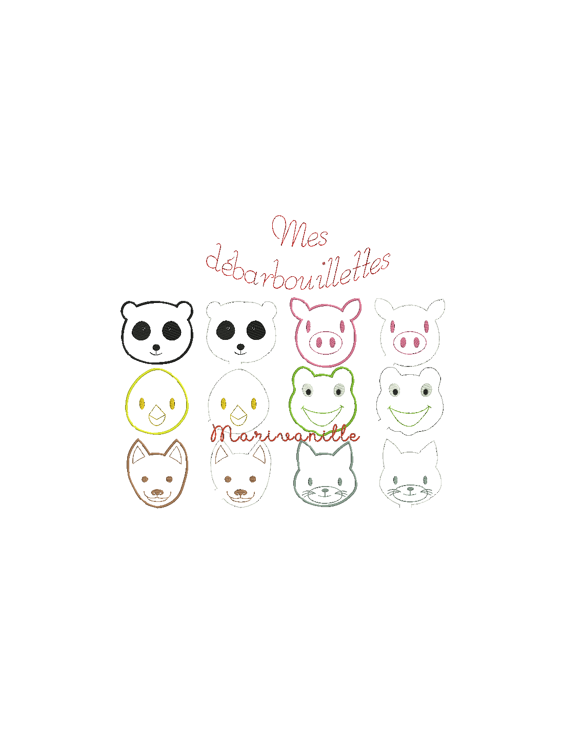 Un chat, un chien, un cochon, une grenouille, un panda, un poussin, pour débarbouiller les minois cracra, en appliqué, ou non, et en 2 tailles