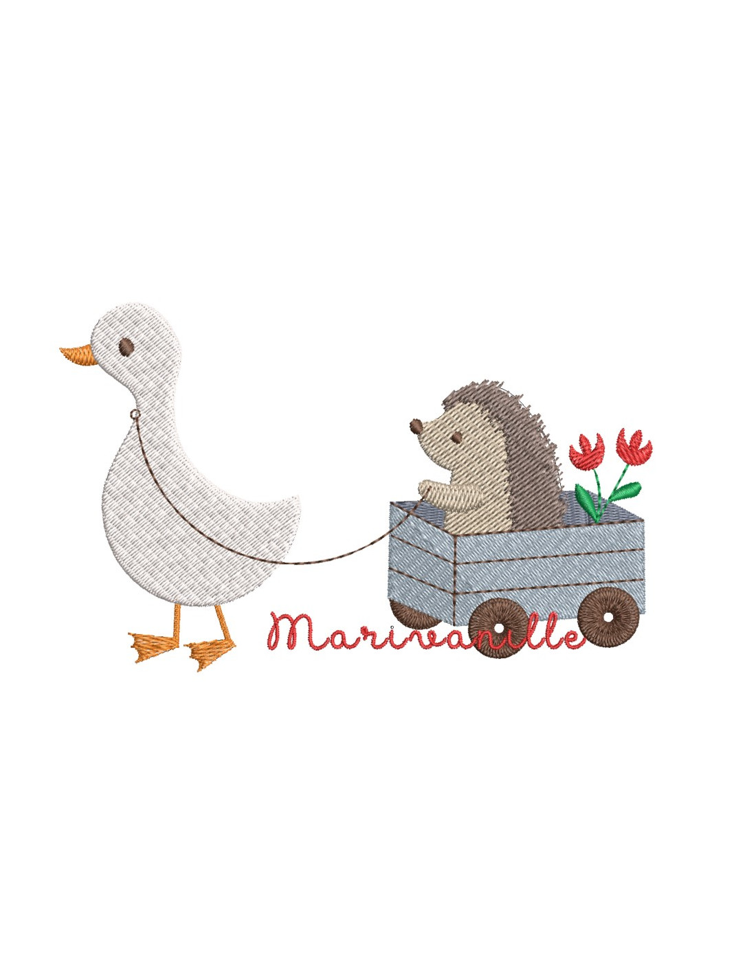 Ce fichier ne contient que le dessin de l'oie tirant un hérisson, les autres broderies sont à retrouver sur le site