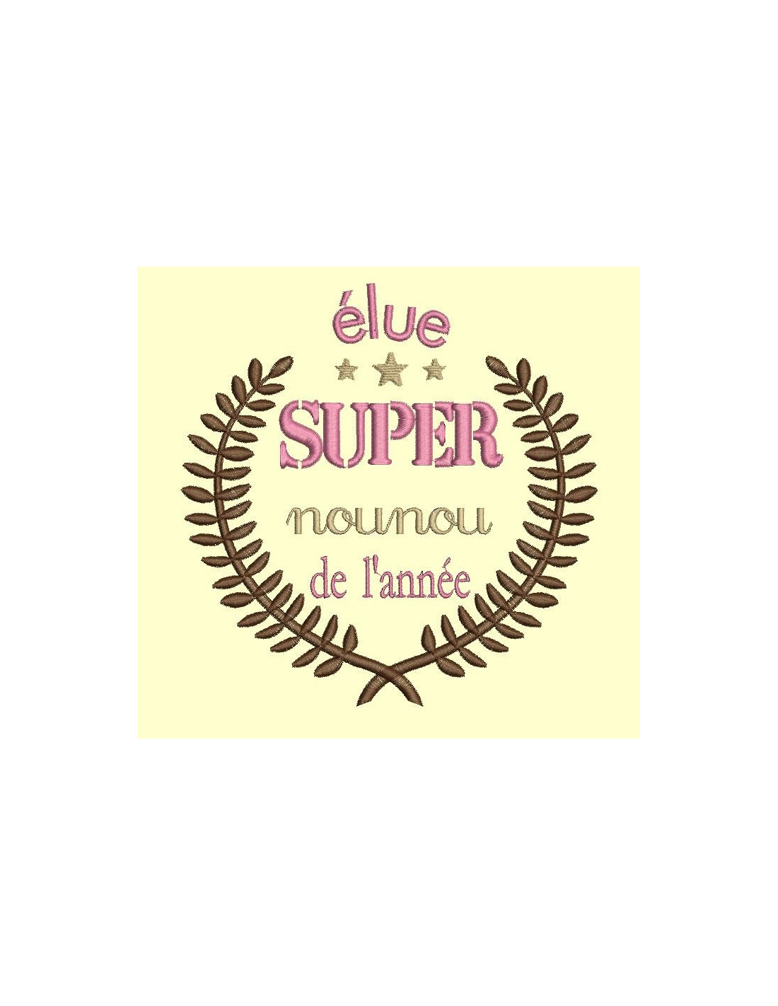 Motif à broder représentant un logo pour super nounou dans une couronne de laurier
