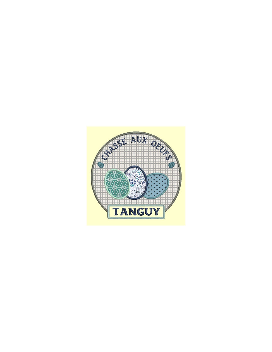 Motif à broder représentant un motif "chasse aux oeufs", oeufs en appliqué, motifs à personnaliser d'un prénom.