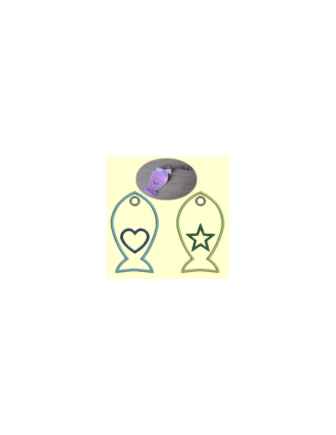 Motif à broder permettant de réaliser un porte clef en forme de poisson avec un coeur ou une étoile en appliqué